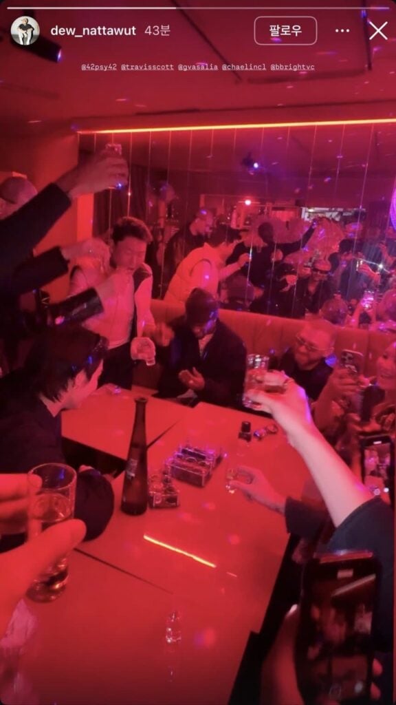 Yang bikin makin seru, ada Psy yang bikin suasana makin hidup dengan toast-nya. Kebayang nggak sih, Psy berdiri di sebelah Travis Scott sambil angkat gelas? Pasti suasananya pecah banget!
